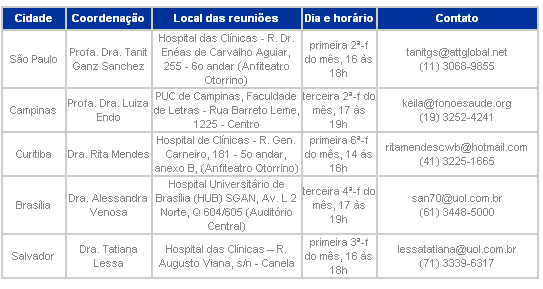 (Profa Dra Luiza Endo), Curitiba (Dra. Rita Mendes), Brasília (Dra. Alessandra